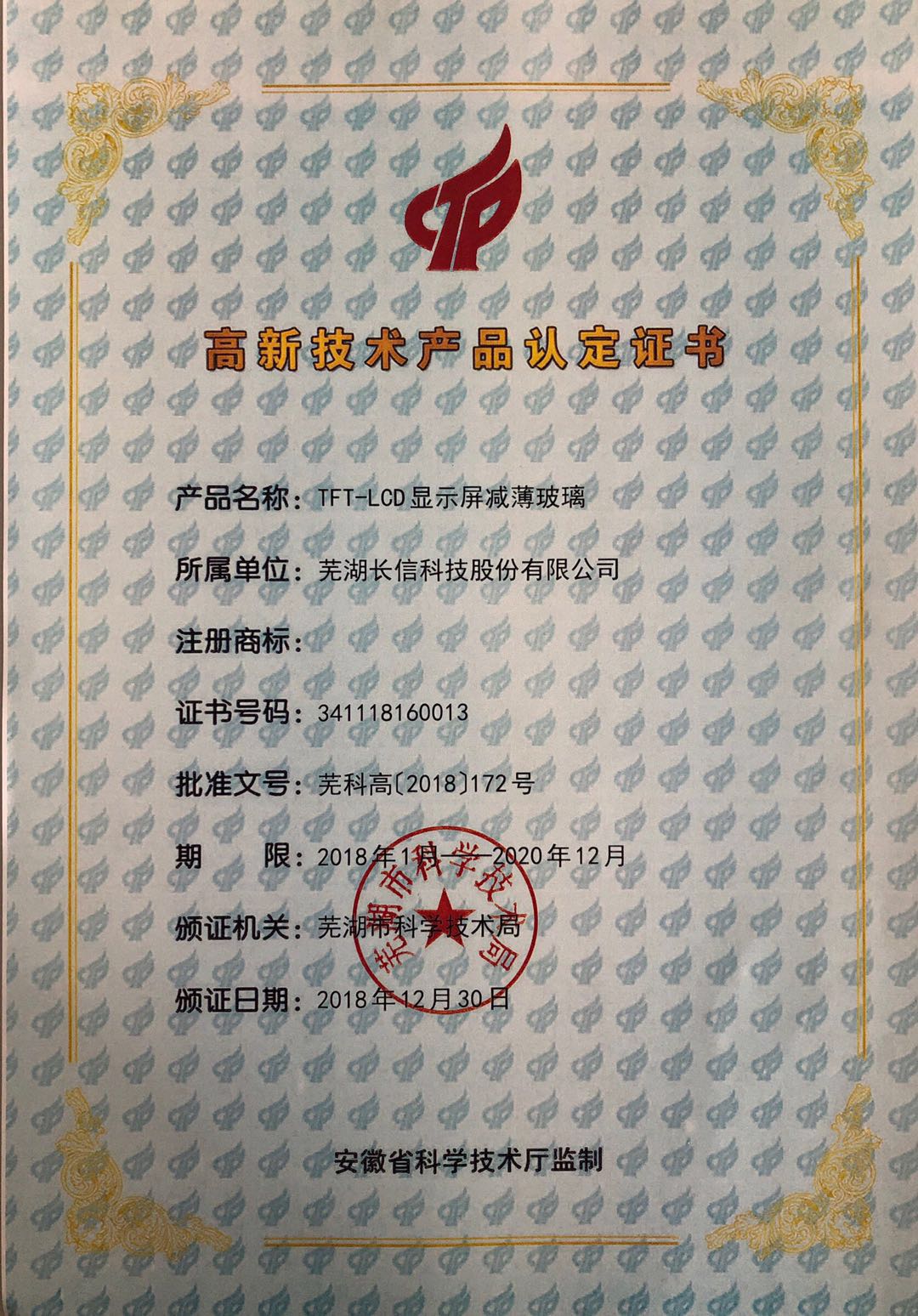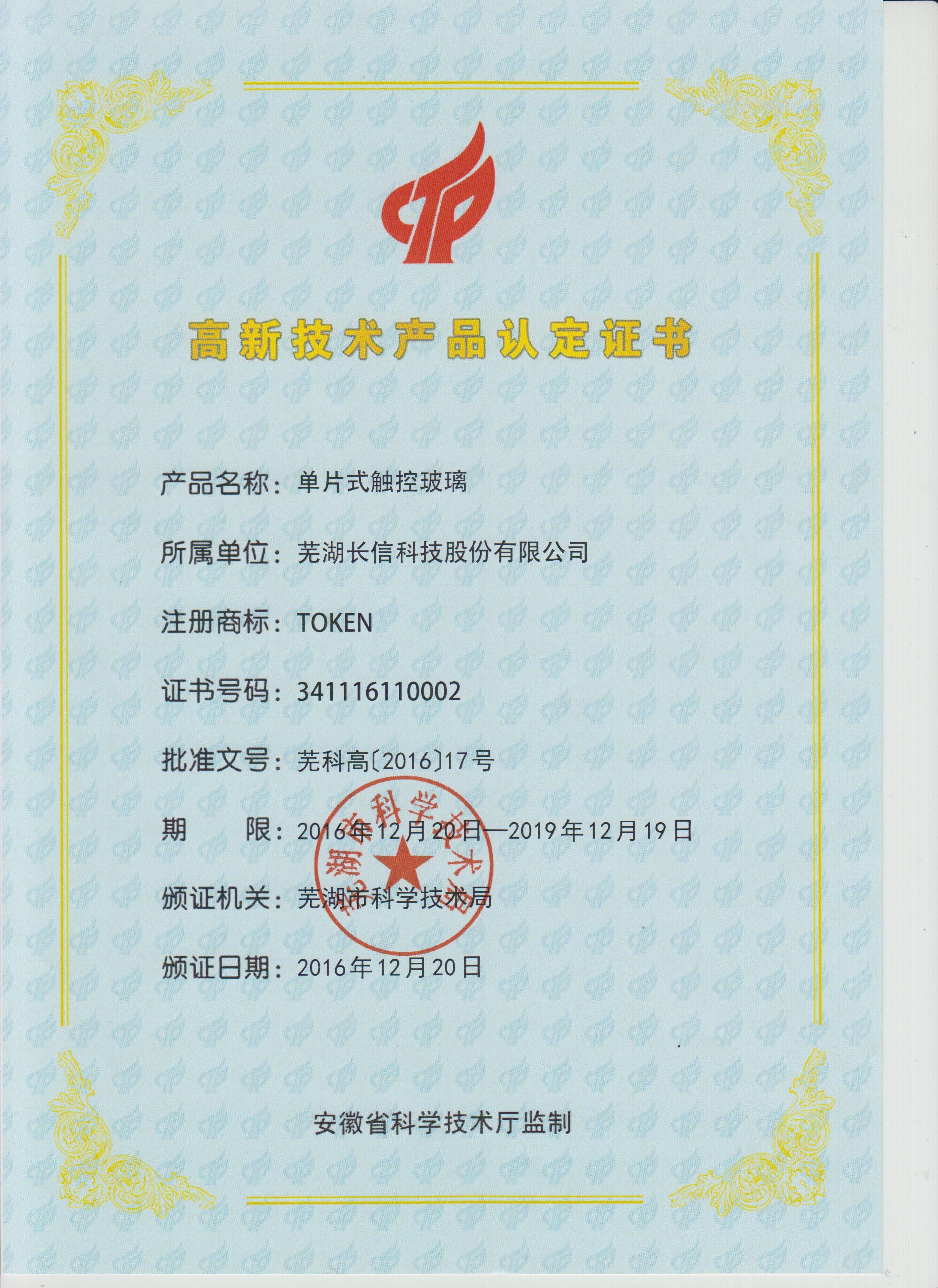 2016年単片式タッチパネルは安徽省高新技術製品を認定された