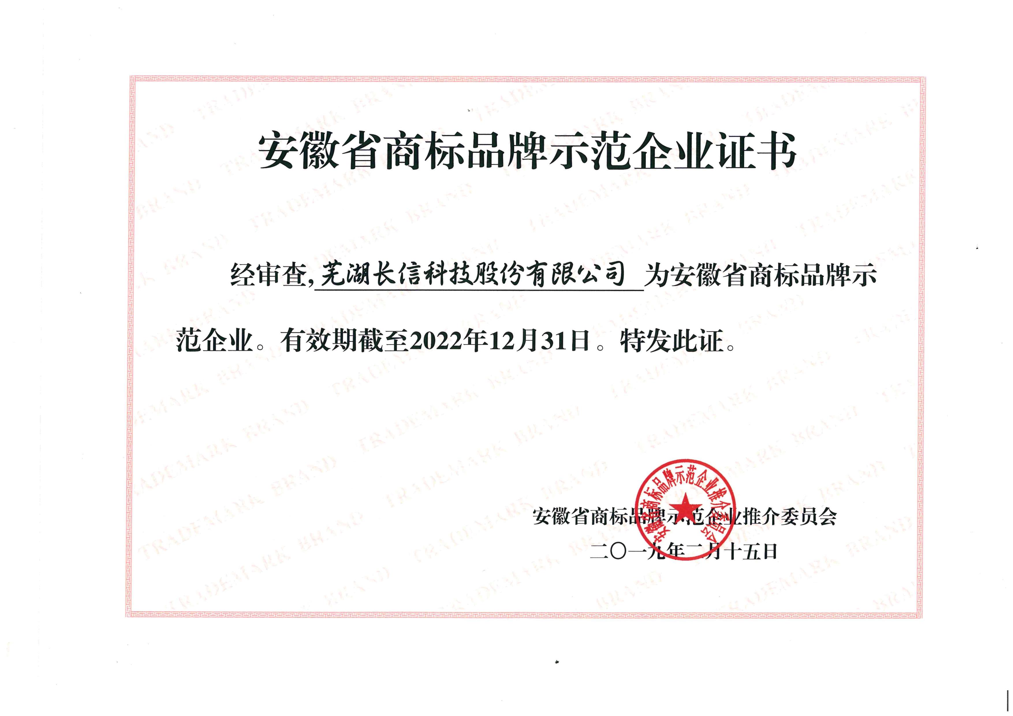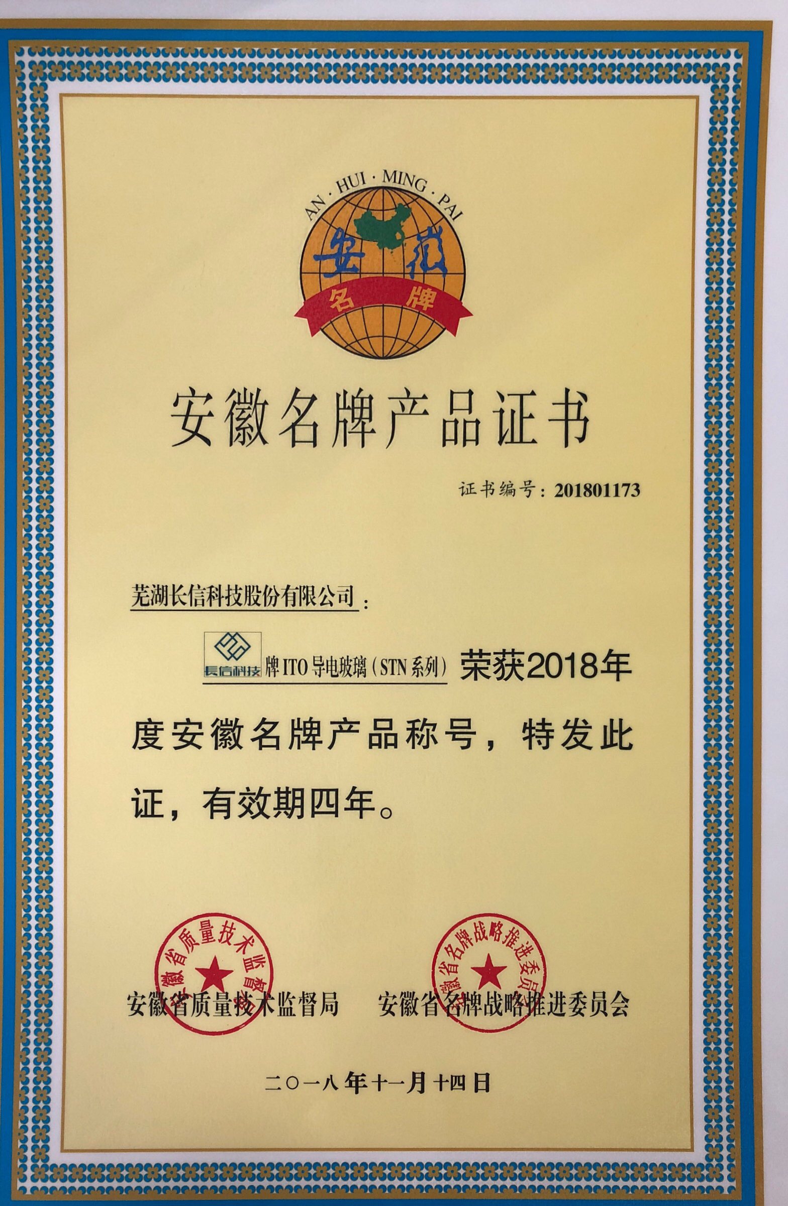 2015年に表面に導電體を被覆したガラスが安徽省の有名商標証書