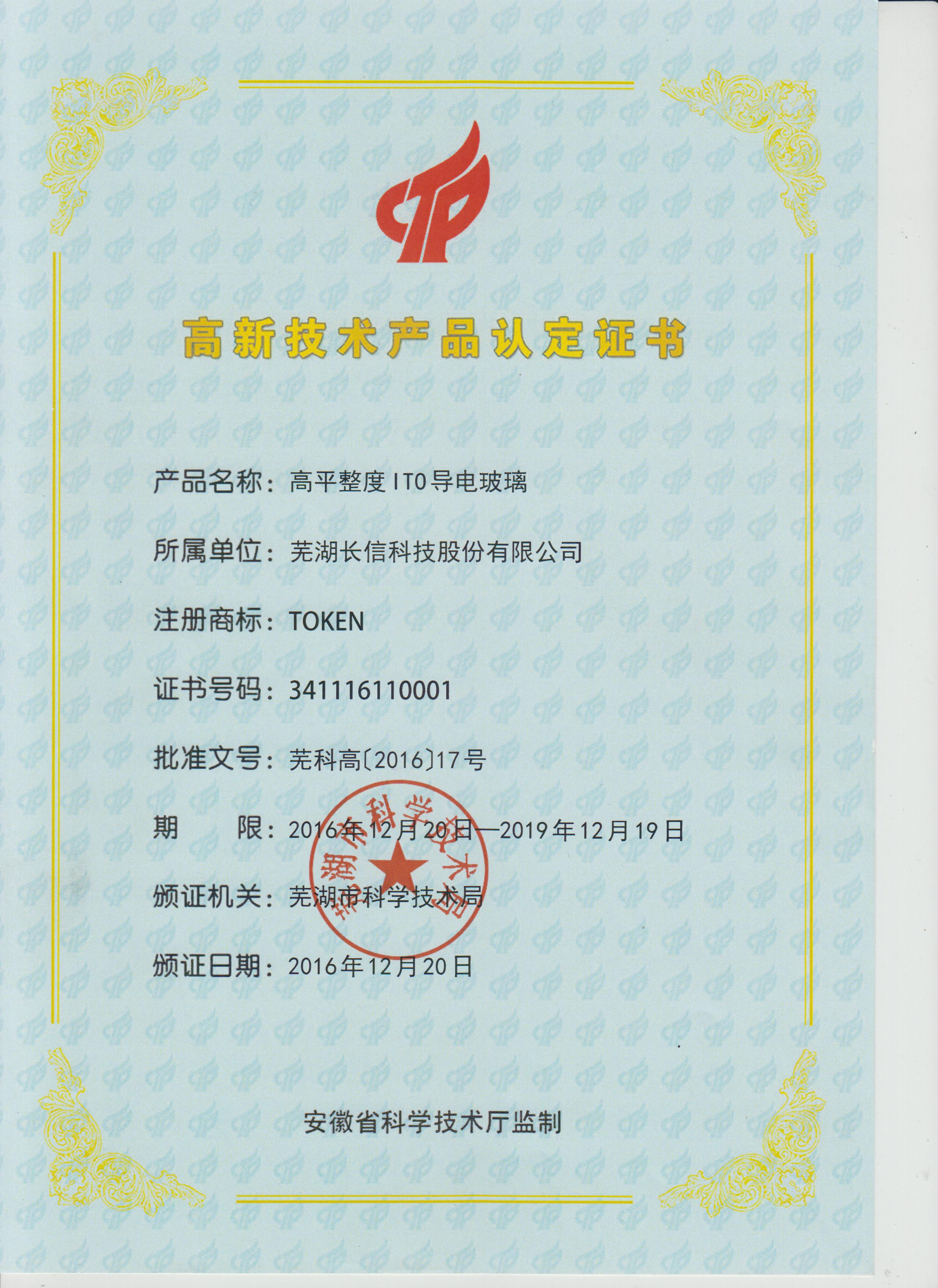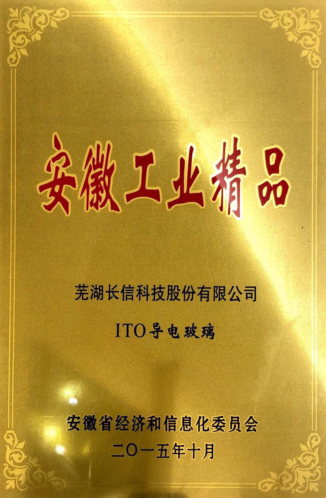 ITO導電ガラスは安徽工業逸品証書を獲得しました
