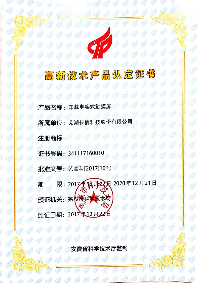 車載容量式タッチパネルハイテク製品証明書