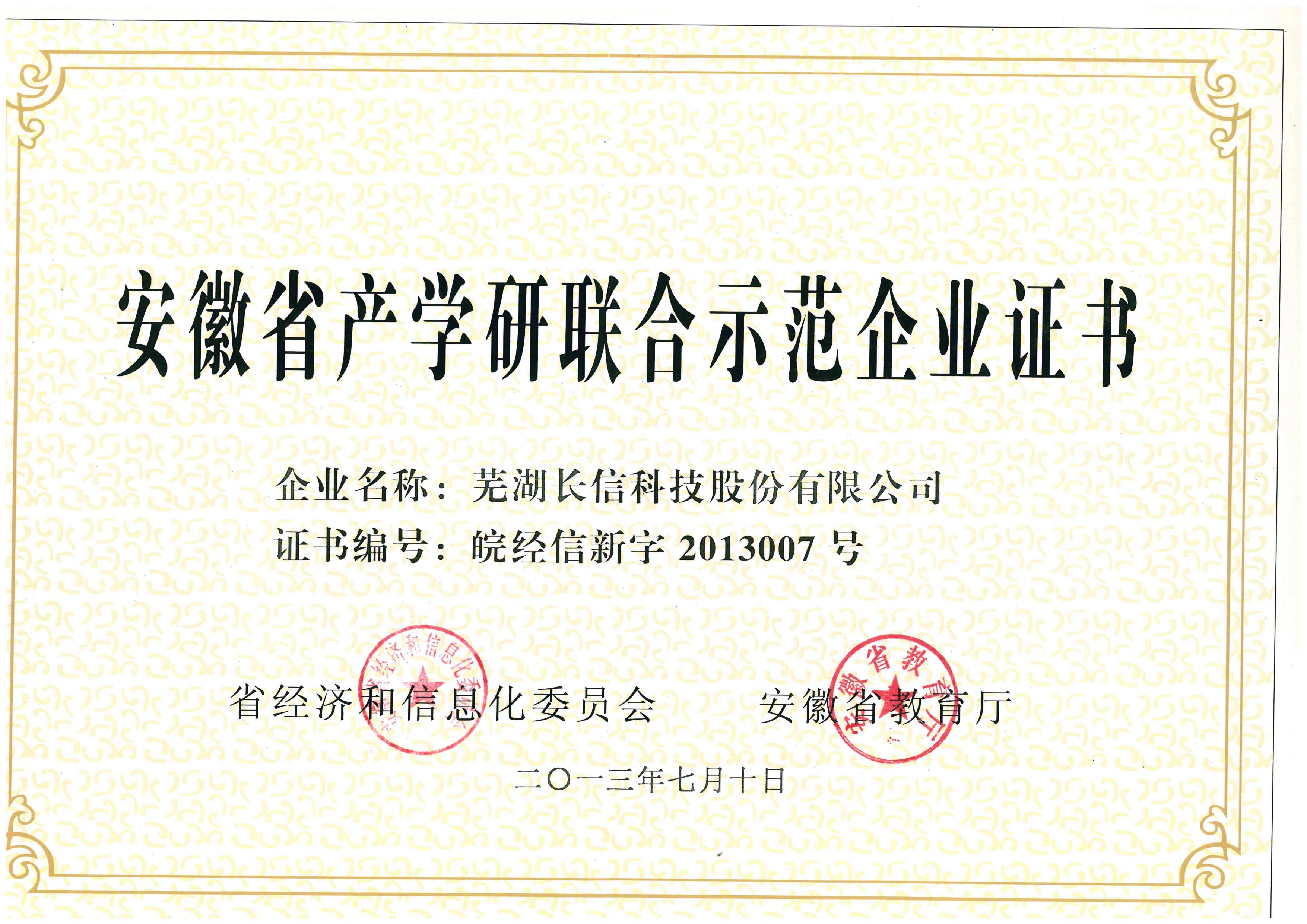 2013安徽省産學研連合模範企業証書