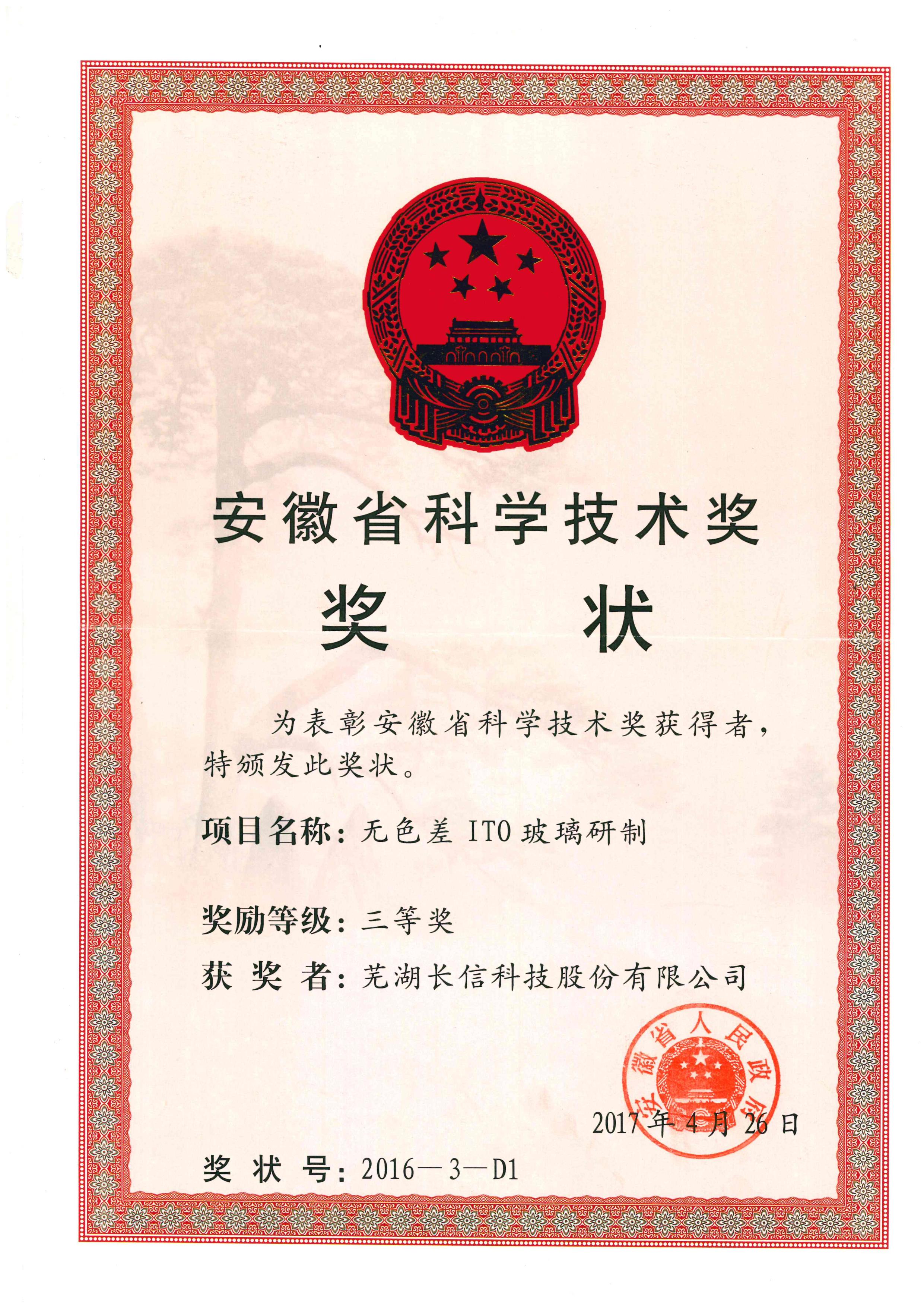 長信無色差ITO導電ガラスが安徽省科學技術賞三等賞証書【會社受賞証書】